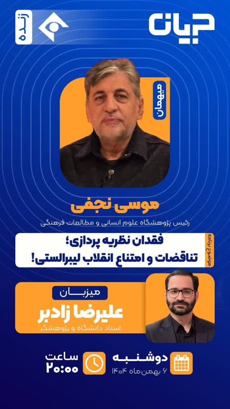 بهمن ۷, ۱۴۰۴بهمن ۶, ۱۴۰۴ از mousanajafi قسمت سیصد و سی و یک میهمان: موسی نجفی رئیس پژوهشگاه علوم انسانی و مطالعات فرهنگی میزبان : علیرضا زادبر استاد دانشگاه و پژوهشگر با موضوع: فقدان نظریه پردازی؛ تناقضات و امتناع انقلاب لیبرالیستی برنامه تلویزیونی جریان دوشنبه ۶ دی ساعت ۲۰:۰۰ | شبکه یک سیما نشانی ما در صفحات اجتماعی: @jaryan_tv1 چرا ۱۸ تا ۲۰ دی انقلاب نبود؟ قیامملی چه ویژگی هایی دارد؟ آیا در انقلاب اسلامی ۱۳۵۷ هم خشونت وجود داشت؟ پاسخ این سوالات گفتگو با استاد دکتر موسی نجفی https://telewebion.com/episode/0x16b77ac8 انتشار در: